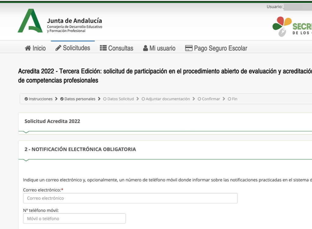 Una vez introducido el Certificado Digital nos aparecerá una ventana con la documentación a rellenar. En este caso, datos personales: