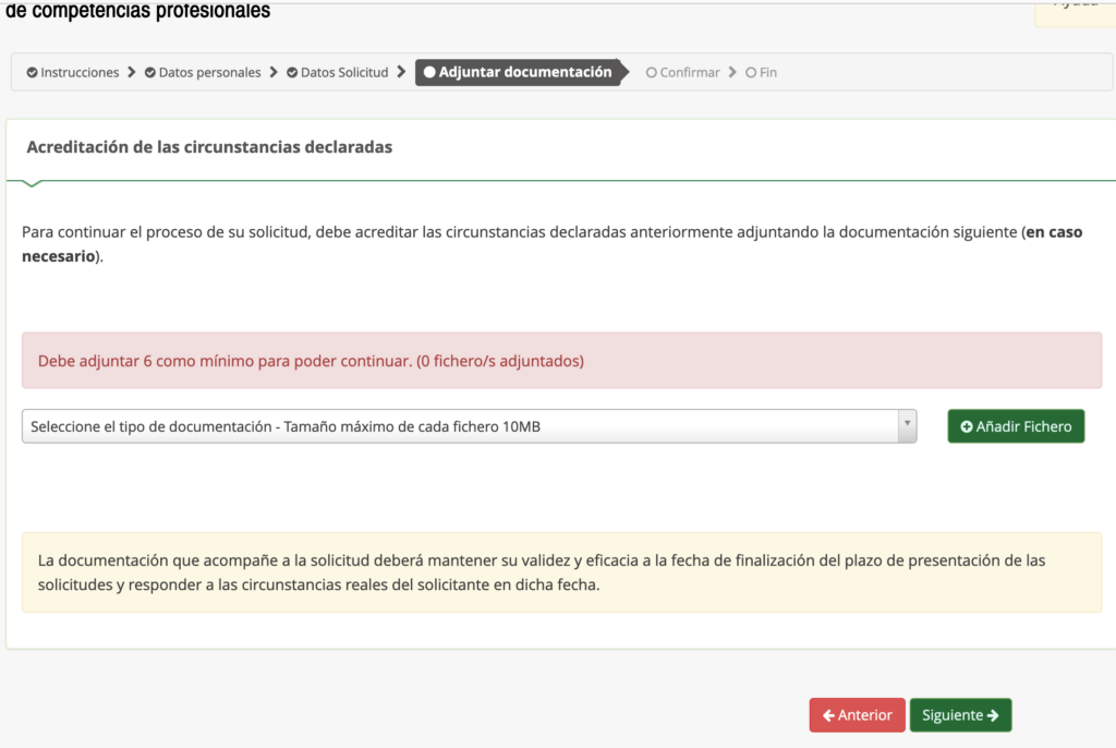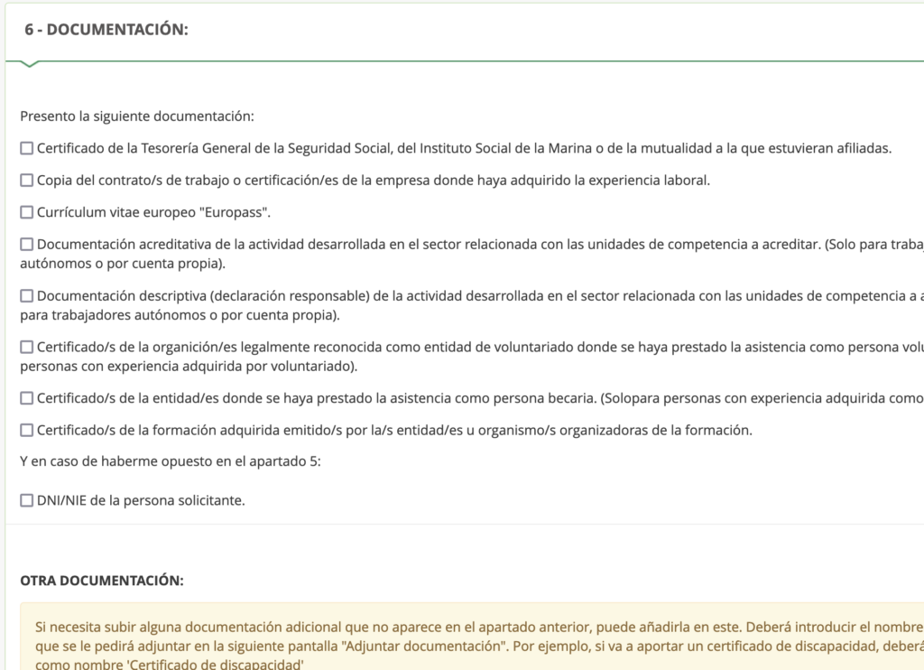 Hay que presentar la documentación que hemos marcado en el apartado 1 de los datos de la solicitud. Es importante tener en cuenta que las competencias se acreditan con 2000 h de experiencia laboral o mediante 300h de formación si son certificaciones de nivel 2-3.